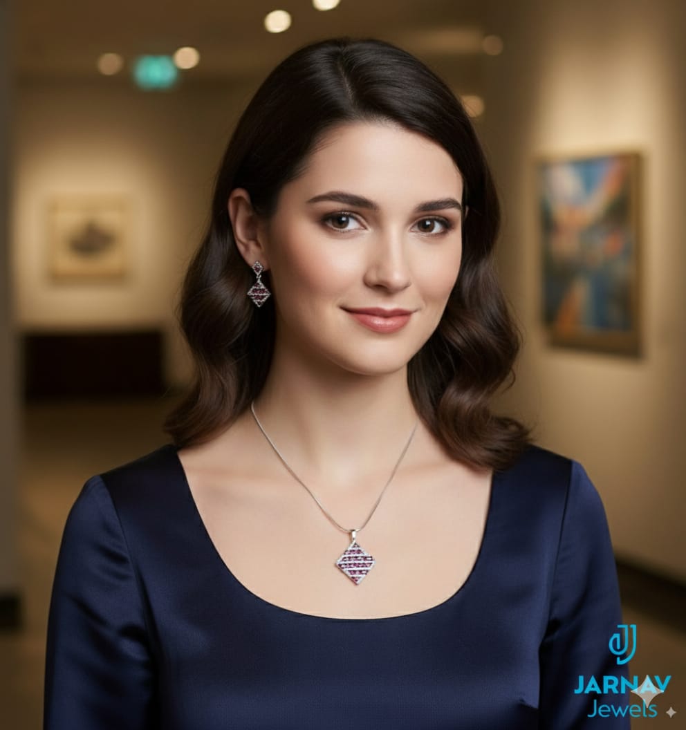 It features a modern, eye-catching triangular or geometric pendant and matching stud earrings.